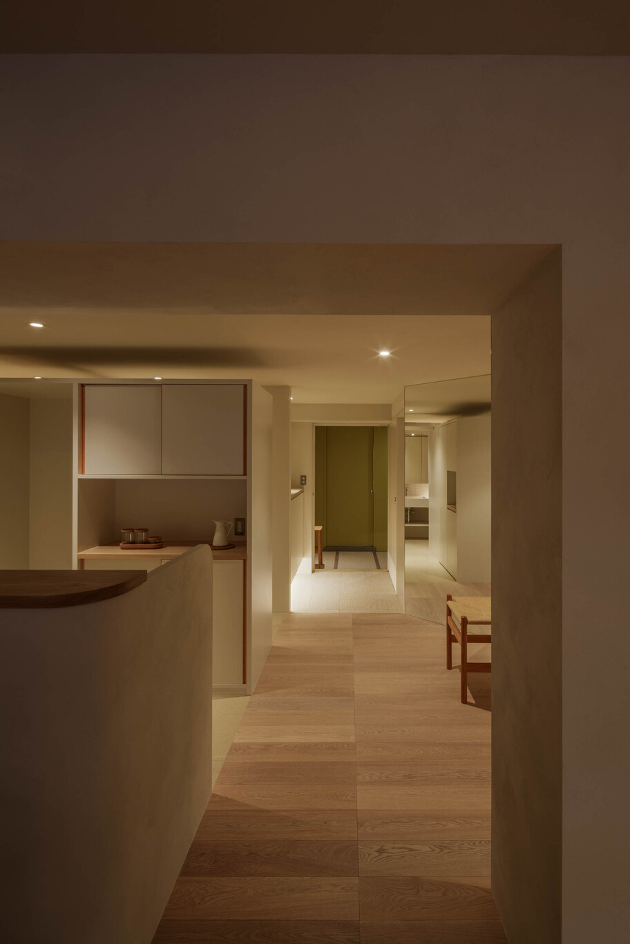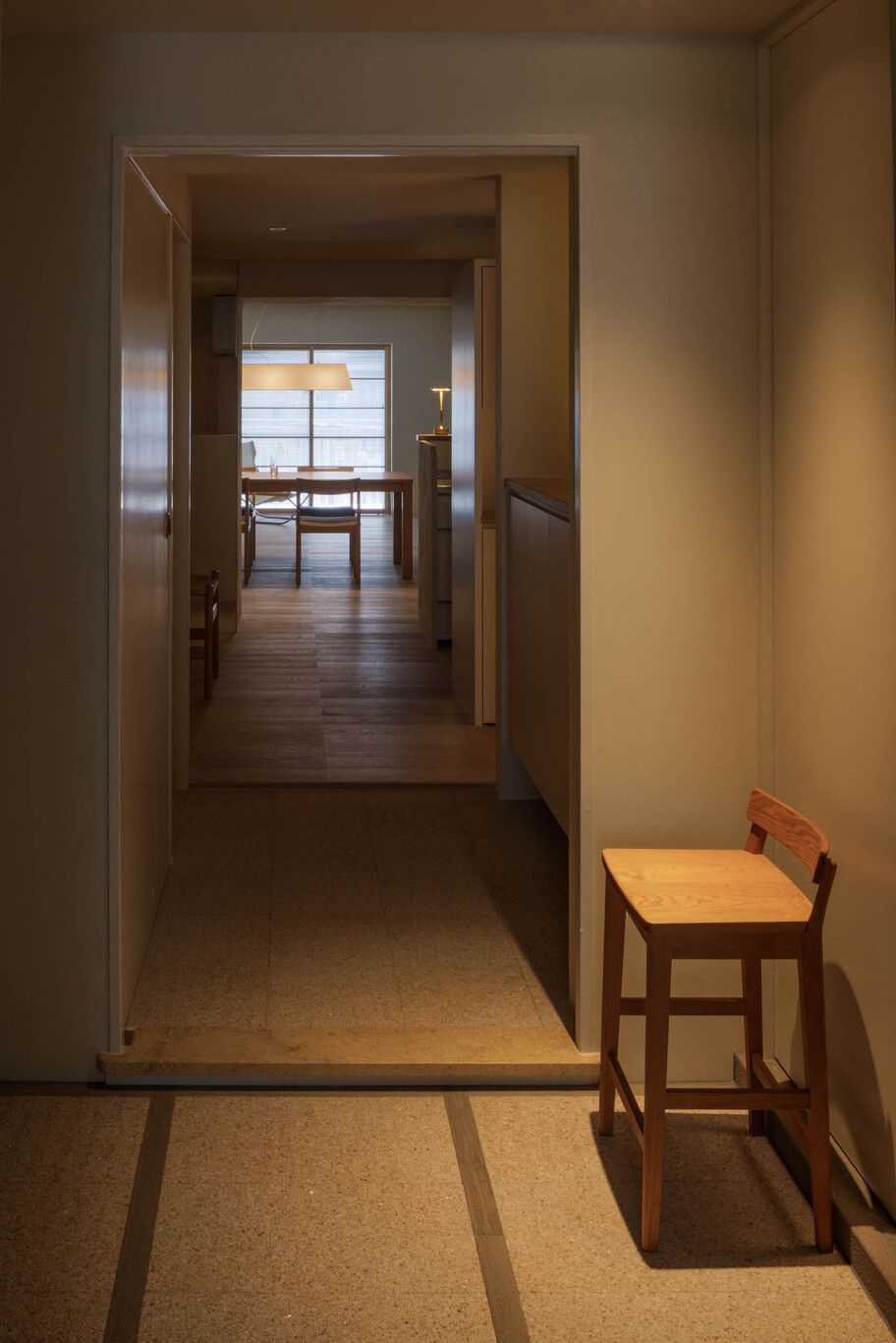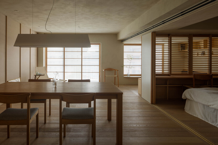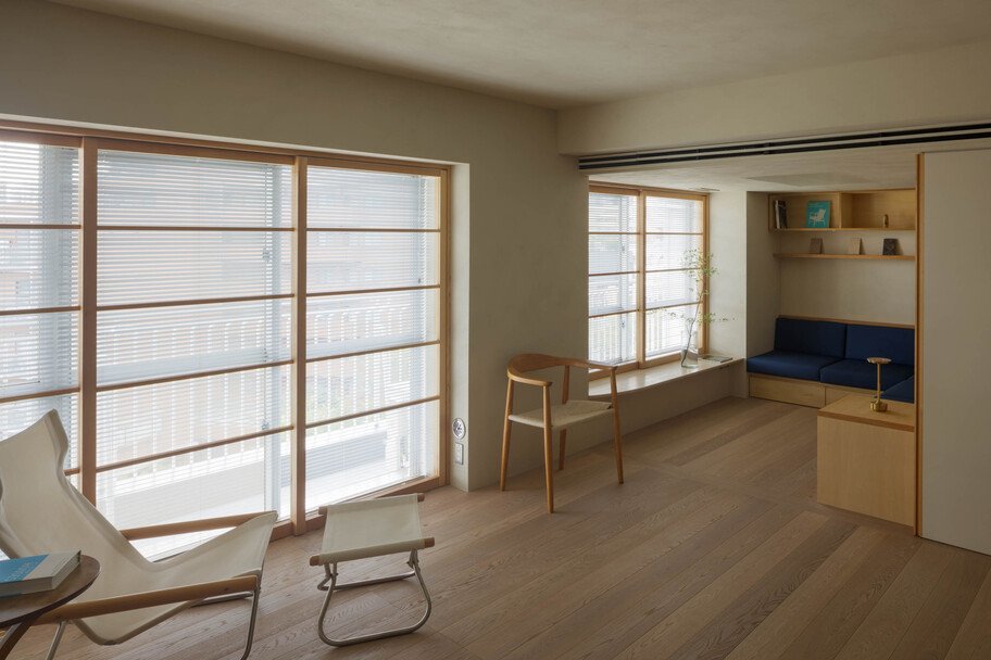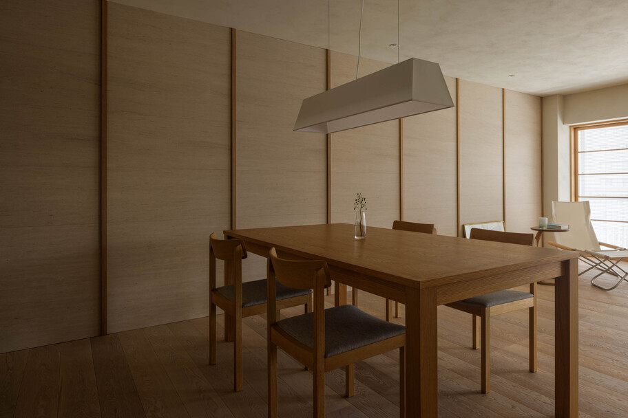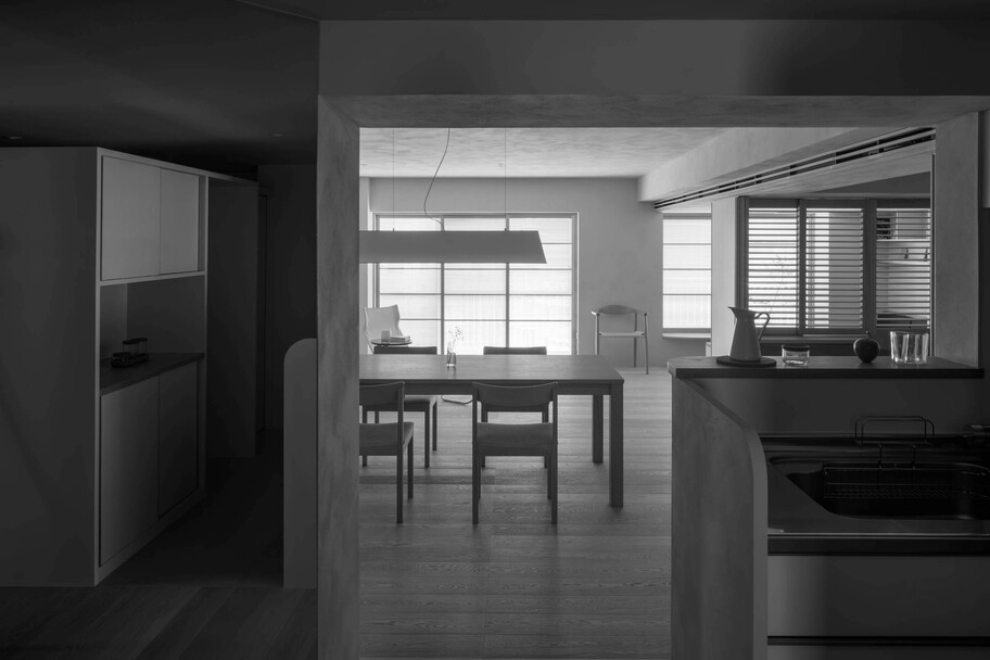 This project involved the renovation of a 50-year-old apartment building in Tokyo. With a floor area of ​​over 100 square meters and a long north-south floor plan, construction costs and lighting conditions presented challenges. Regarding construction costs, the floor plan was divided into three construction grades: simple renovation (renovation of the interior), partial renovation (fittings utilizing the existing foundation), and full renovation. Each grade was linked to the space’s intended use, function, and future changes, achieving a balance between budget and quality. The lighting issue was addressed by utilizing the reflection of light from mirrors. Two mirrors were installed at a 45-degree angle to the window, allowing light to reach even the dark space. The angled mirrors also broadened the view, creating a mysterious, labyrinth-like atmosphere. The living room, dining room, and master bedroom are all one-room spaces reminiscent of a hotel, with varying ceiling heights providing spaces suited to different uses. The difference in the scale of construction meant that the existing interior and the new interior came into conflict, resulting in an interior that blends past and present. We feel that this is a residence with a rich expression that is unique to this unit.