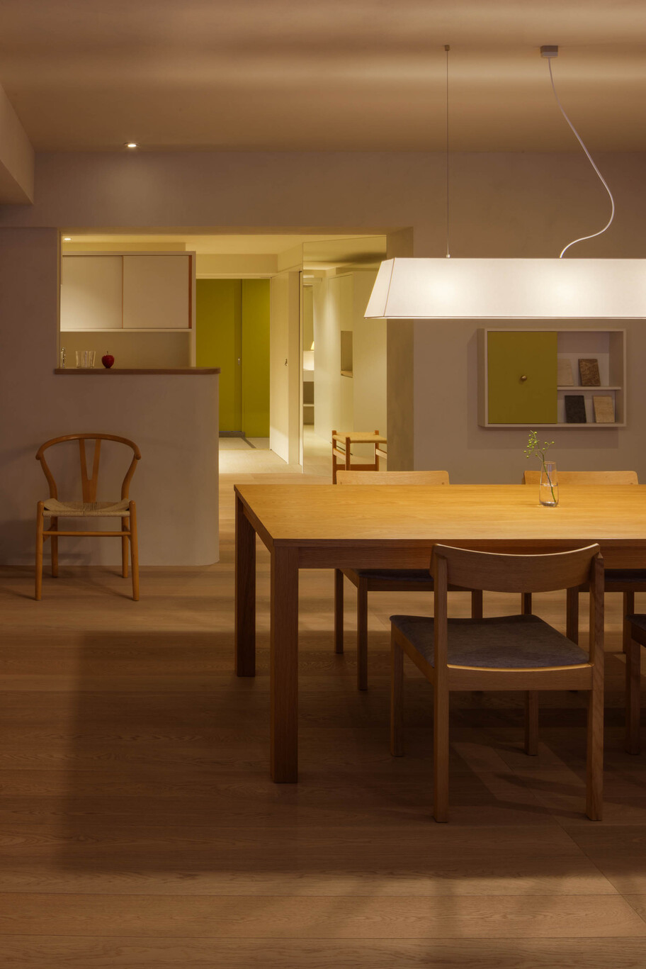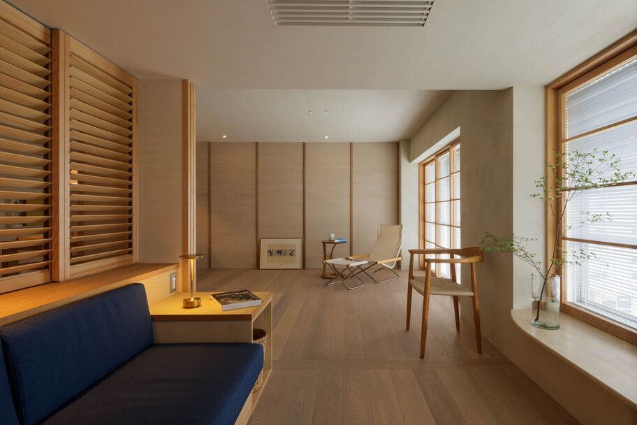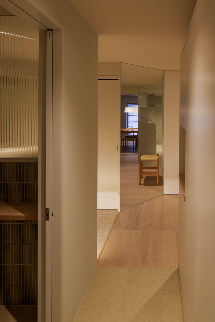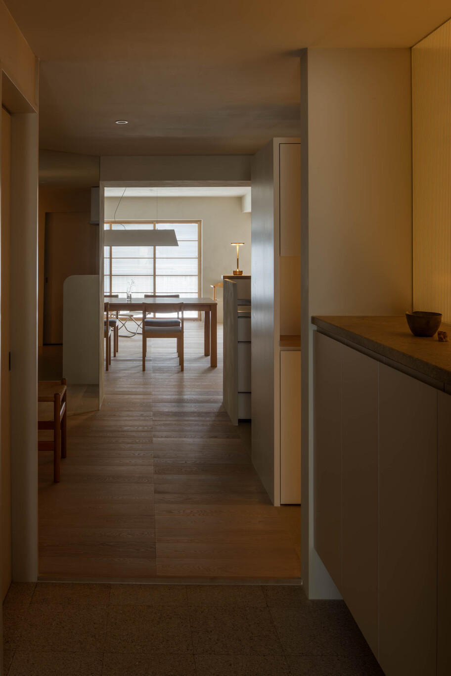 This project involved the renovation of a 50-year-old apartment building in Tokyo. With a floor area of ​​over 100 square meters and a long north-south floor plan, construction costs and lighting conditions presented challenges. Regarding construction costs, the floor plan was divided into three construction grades: simple renovation (renovation of the interior), partial renovation (fittings utilizing the existing foundation), and full renovation. Each grade was linked to the space’s intended use, function, and future changes, achieving a balance between budget and quality. The lighting issue was addressed by utilizing the reflection of light from mirrors. Two mirrors were installed at a 45-degree angle to the window, allowing light to reach even the dark space. The angled mirrors also broadened the view, creating a mysterious, labyrinth-like atmosphere. The living room, dining room, and master bedroom are all one-room spaces reminiscent of a hotel, with varying ceiling heights providing spaces suited to different uses. The difference in the scale of construction meant that the existing interior and the new interior came into conflict, resulting in an interior that blends past and present. We feel that this is a residence with a rich expression that is unique to this unit.