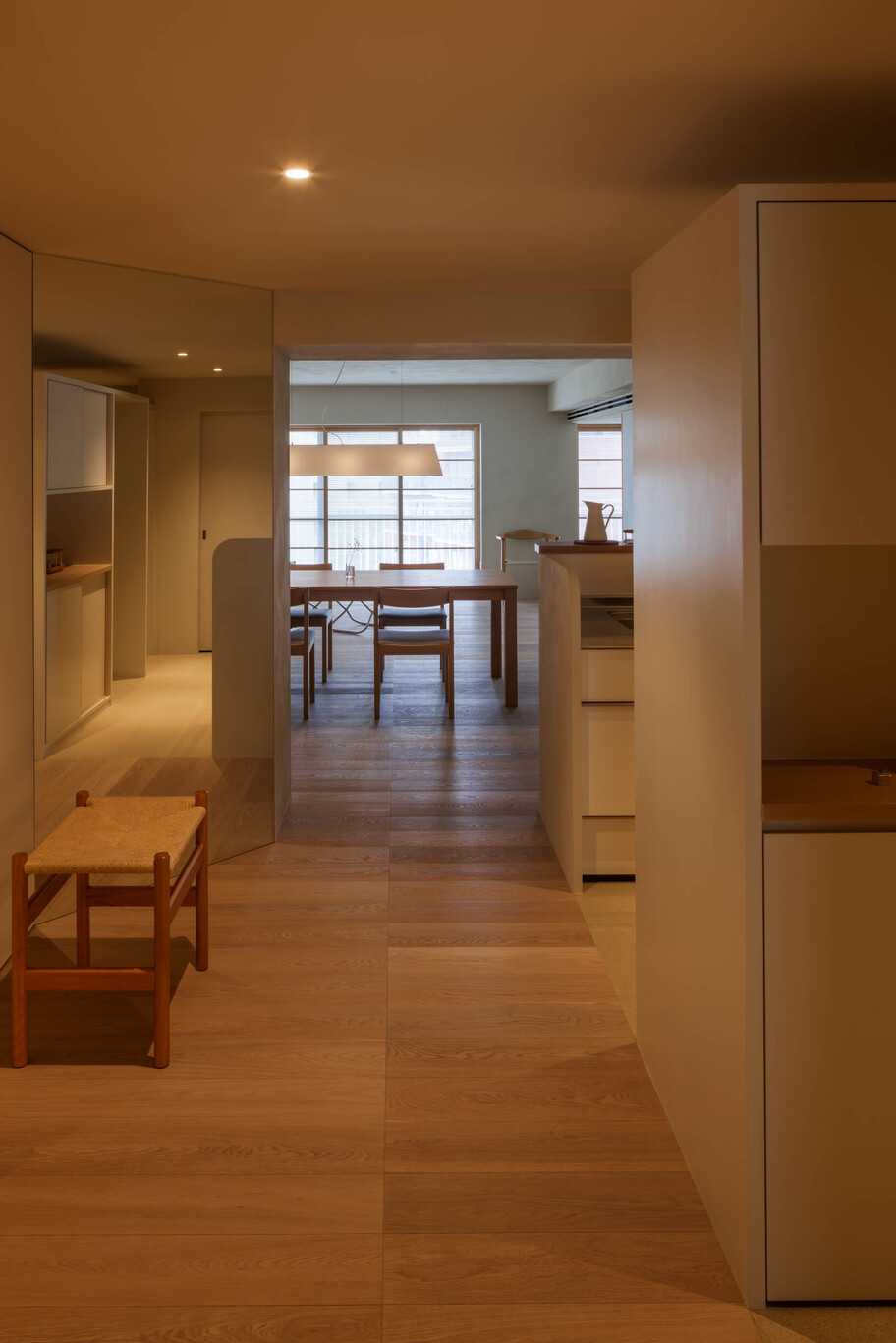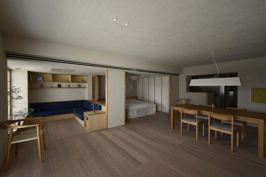 都内の築50年経つマンションの一住戸のリノベーション。床面積が100㎡以上の広さを持ち、間口である南北方向に長い平面形状である事で工事費用や採光状況においての課題があった。建設費については、簡易リノベーション(内装の貼替工事)、部分リノベーション(既存下地を活かした造作工事)、フルリノベーションの3つの工事規模に平面を区分し、それぞれの工事規模と空間の用途や機能、将来的な変化と紐づけることで予算と空間の質のバランスを取っている。採光の問題については、鏡による光の反射を利用して解決を試みた。窓に対して45度となるように、ハの字に2枚の鏡を設置することで、光を暗い空間まで届けている。また、斜めの鏡は、視線の広がりも生み出し、迷宮のような不思議な空間を演出してくれた。居間・食堂・主寝室の空間はホテルのようなワンルーム空間となっており、天井の高さの緩急により、用途に合わせた居場所を設えた。工事規模の違いで生まれる既存内装と新設内装との取り合いにより、過去と現在が融和したインテリアとなった。この住戸ならではの、表情豊かな住まいになったと感じている。