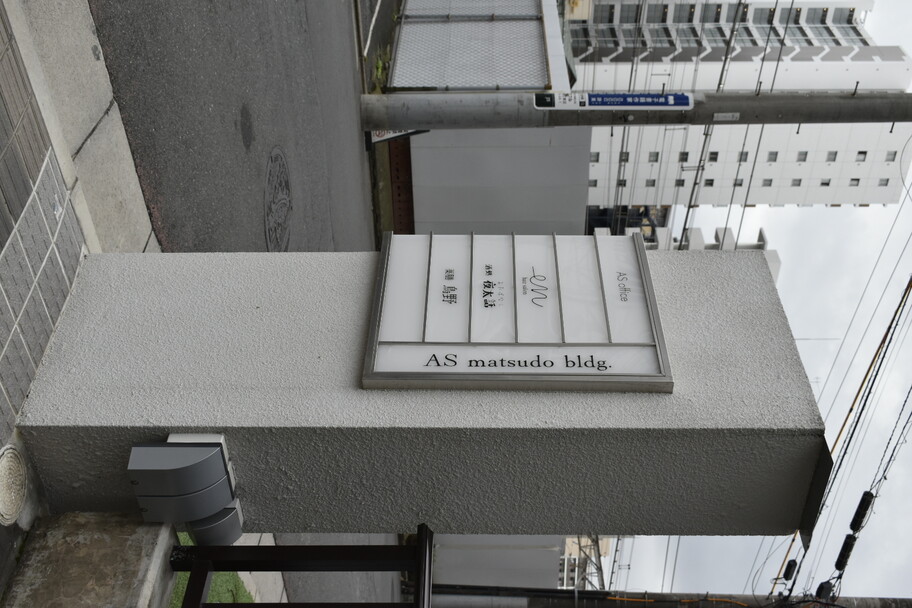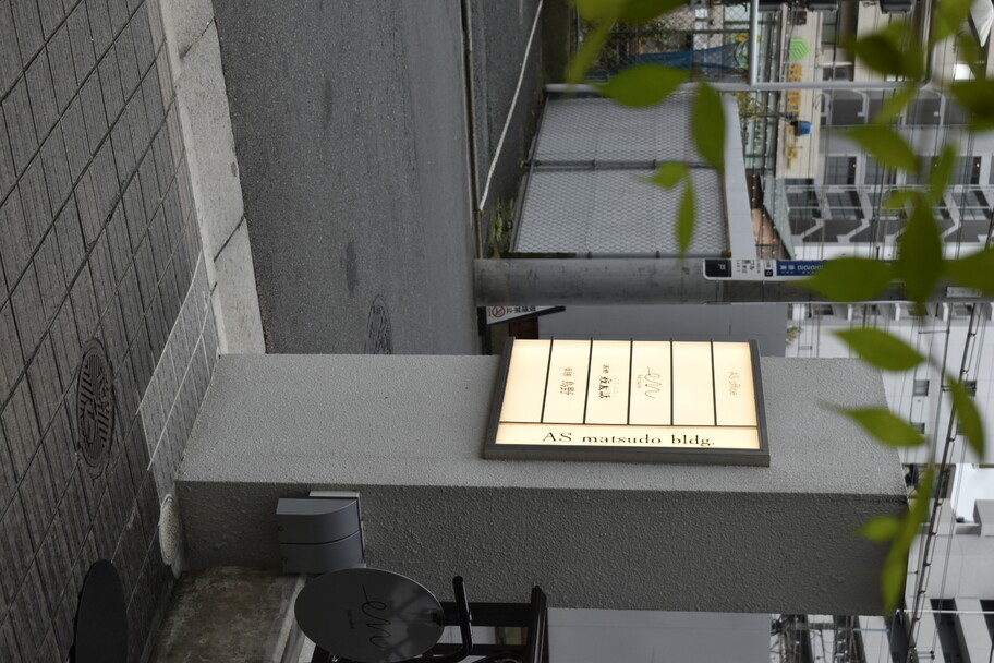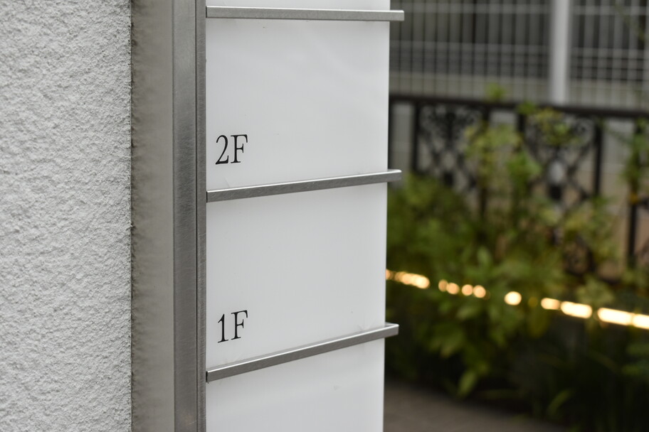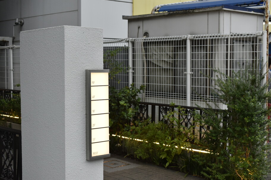 生まれた計画は、四角柱のRC構造物にステンレスバイブレーションフレームで作られたアクリル乳白の発光パネルをコーナー部に埋め込んだシンプルな造形の看板門柱である。駅から来る歩行者にとって最も視認しやすい広い面をテナント名、短い面は階数表示とし、コーナーパネルの利点を看板デザインに活かしている。また、歩行者に威圧的にならないように、高さはヒューマンスケールの全高1.8mとしている。表面仕上は、無機質で工業的な素材で立ち並ぶ駅前ビル群の中で、あえて自然素材による荒い左官仕上とし、はっと目を惹くように白系の色味とした。さらに、雨垂れによる汚れを考慮して、天端は片勾配としてステンレスプレートによる水切りを接着している。その造形は、まるで小さなビルのような看板門柱となった。また、店舗ビルまでのアプローチの造園計画、照明計画のデザインコーディネートも行っている。看板というと目立つ必要があるからこそ、派手でカラフルに計画する場合が多いかもしれない。しかし、喧騒とした街中で、逆にシンプルな造形で静かな光で佇むことで、人は心を動かされ視認し、歩みを止めるのではないかと考えている。